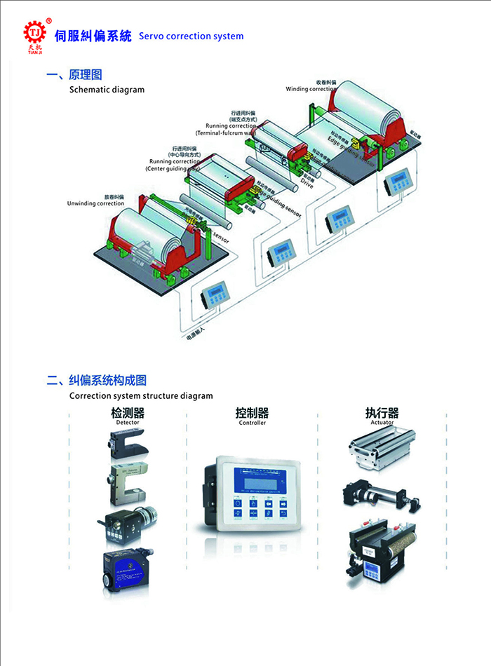 是自动纠正卷材横向偏差的自动化闭环系统。其工作原理为:纠偏传感器检测卷材边缘、线条或色块的相对位置,比较检测值与设定值偏差量经过控制器程序计算后转换成成比例的信号给电动驱动器进行纠正。纠偏控制系统由控制器、检边/检线传感器、电动驱动器、纠偏机构等部件构成。系统分为收放卷纠偏系统和行进中纠偏机构(可定制)。检测方式有检边、检线和对中。