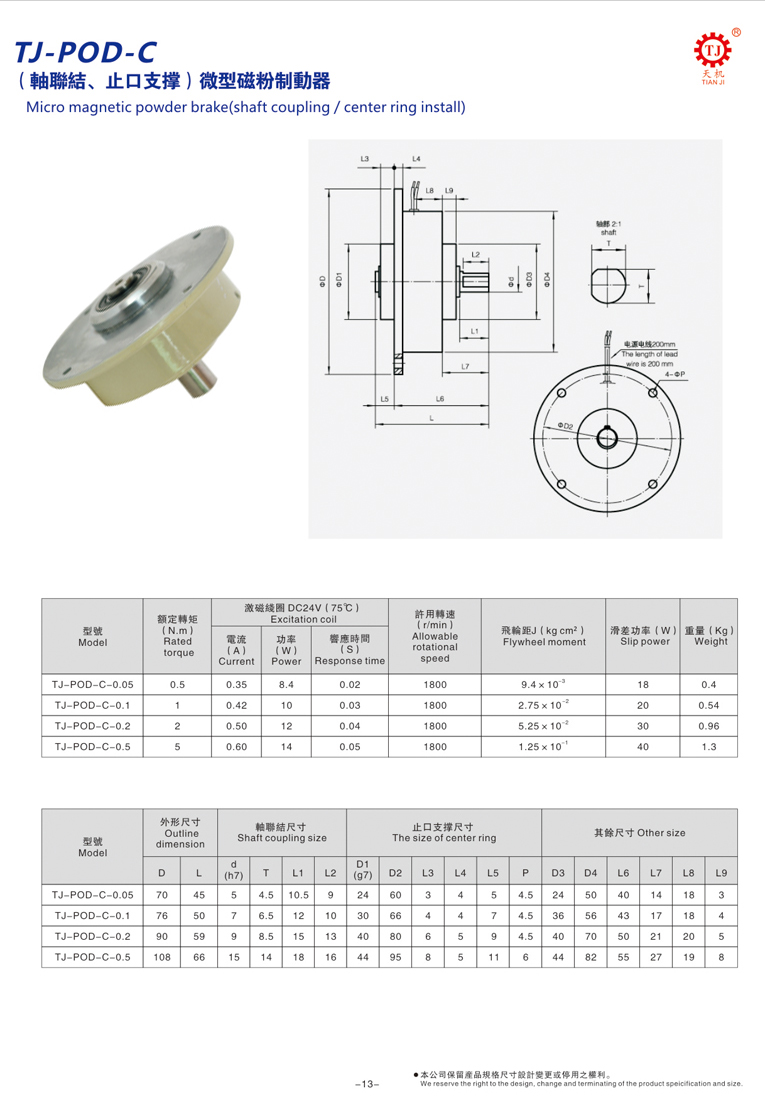 POD-C微型轴式磁粉制动器的选型一般以所需传达最大转矩为依据来选定,并同时注意保证实际滑差功率小于磁粉离合器、制动器的允许滑差功率。