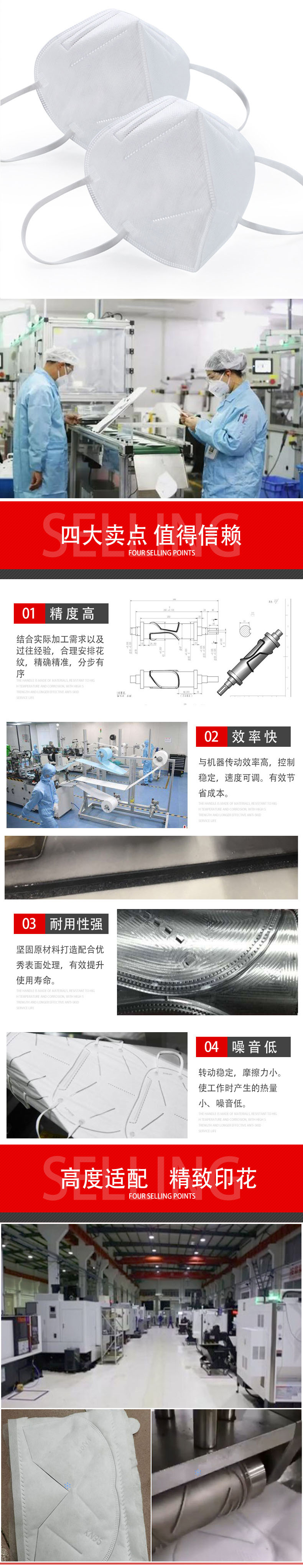 2、kn95口罩机压花辊传动精准,控制稳定,速度可调,操作简单快捷,节省加工时间与加工成本。